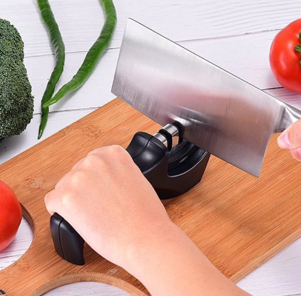Pase la hoja del cuchillo por el afilador; con 3 a 4 pasadas quedará afilado.